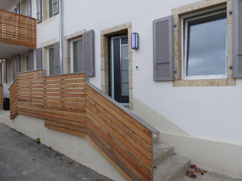 Les gardes-corps sont en tubes inox recouverts de lames de bois, les matériaux choisis sont de très bonne gamme.