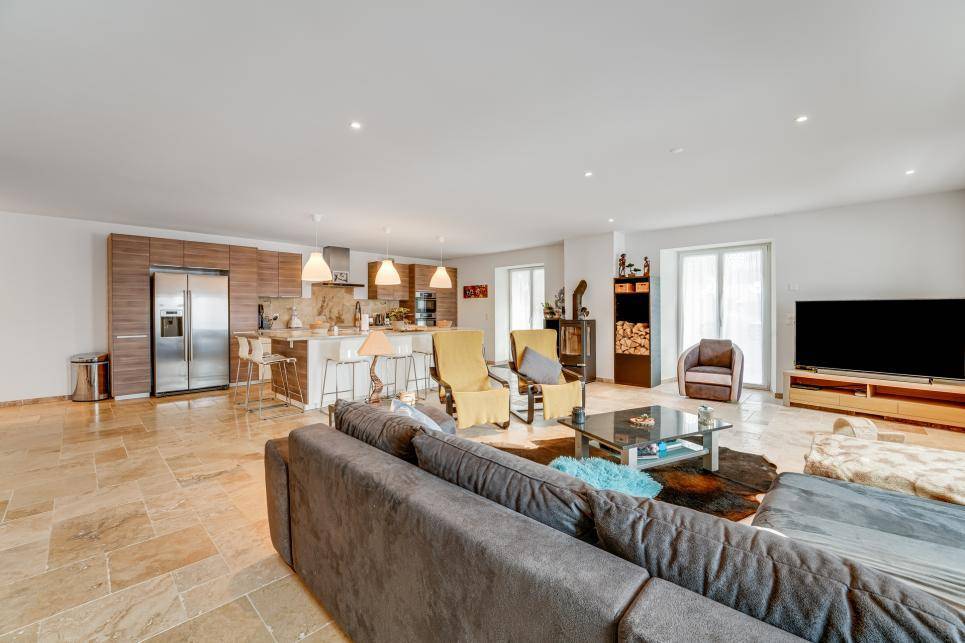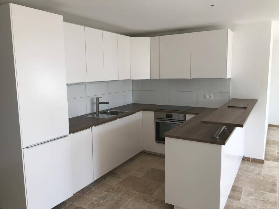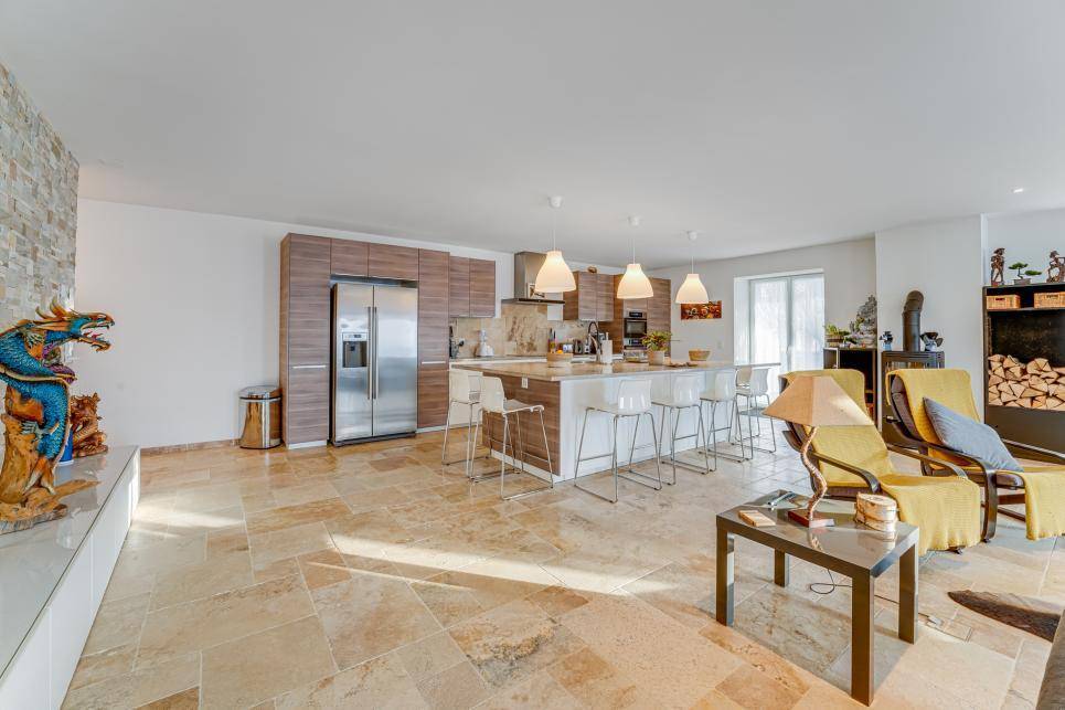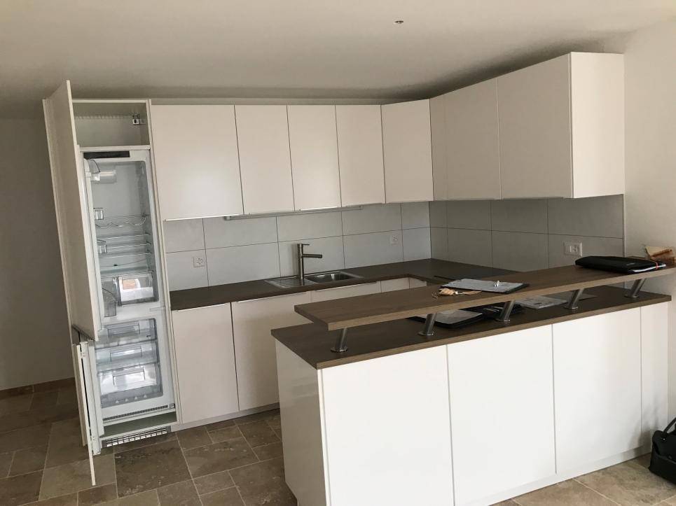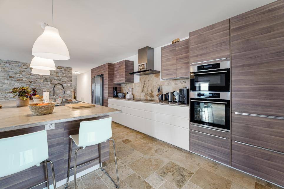 Les cuisines sont toutes agencées avec des agencements ouverts sur les séjours. L'aménagement du grand appartement est de très bonne gamme avec frigo américain, divers fours, plaque d'induction et grand bloc central servant d'évier ainsi que de table centrale recouverte en béton ciré.