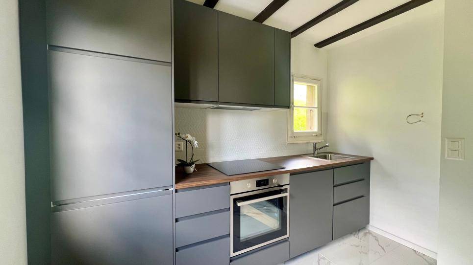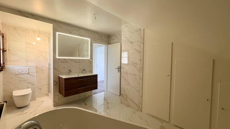 Au rez-supérieur, vous arriverez dans la pièce à vivre avec cheminée, balcon d'environ 20 m2, belle cuisine neuve et entièrement équipée, WC-visiteur et coin bureau.
