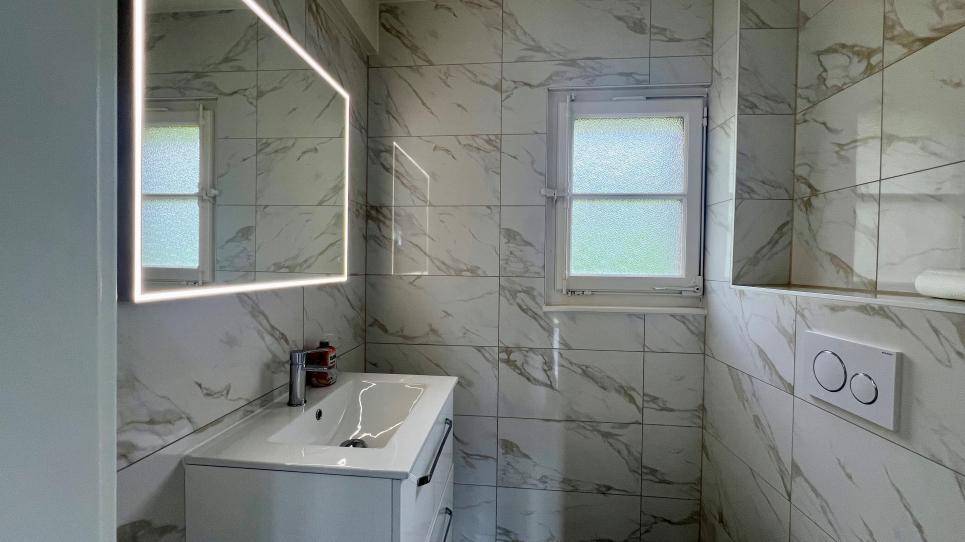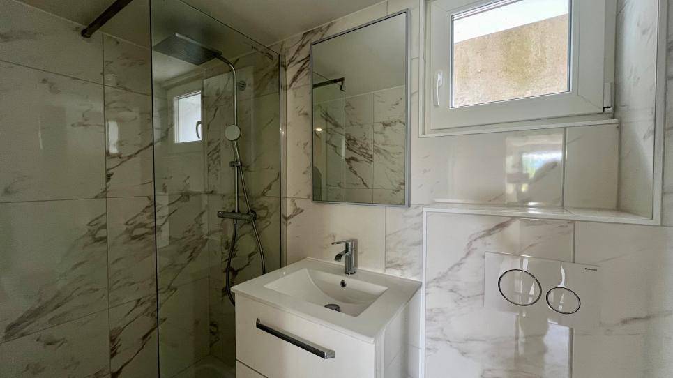 Deux chambres à coucher au rez-inférieur avec accès à une grande terrasse d'environ 50 m2 et une salle de bain équipée d'une douche se trouvent au même niveau. Local technique et rangement/disponible.