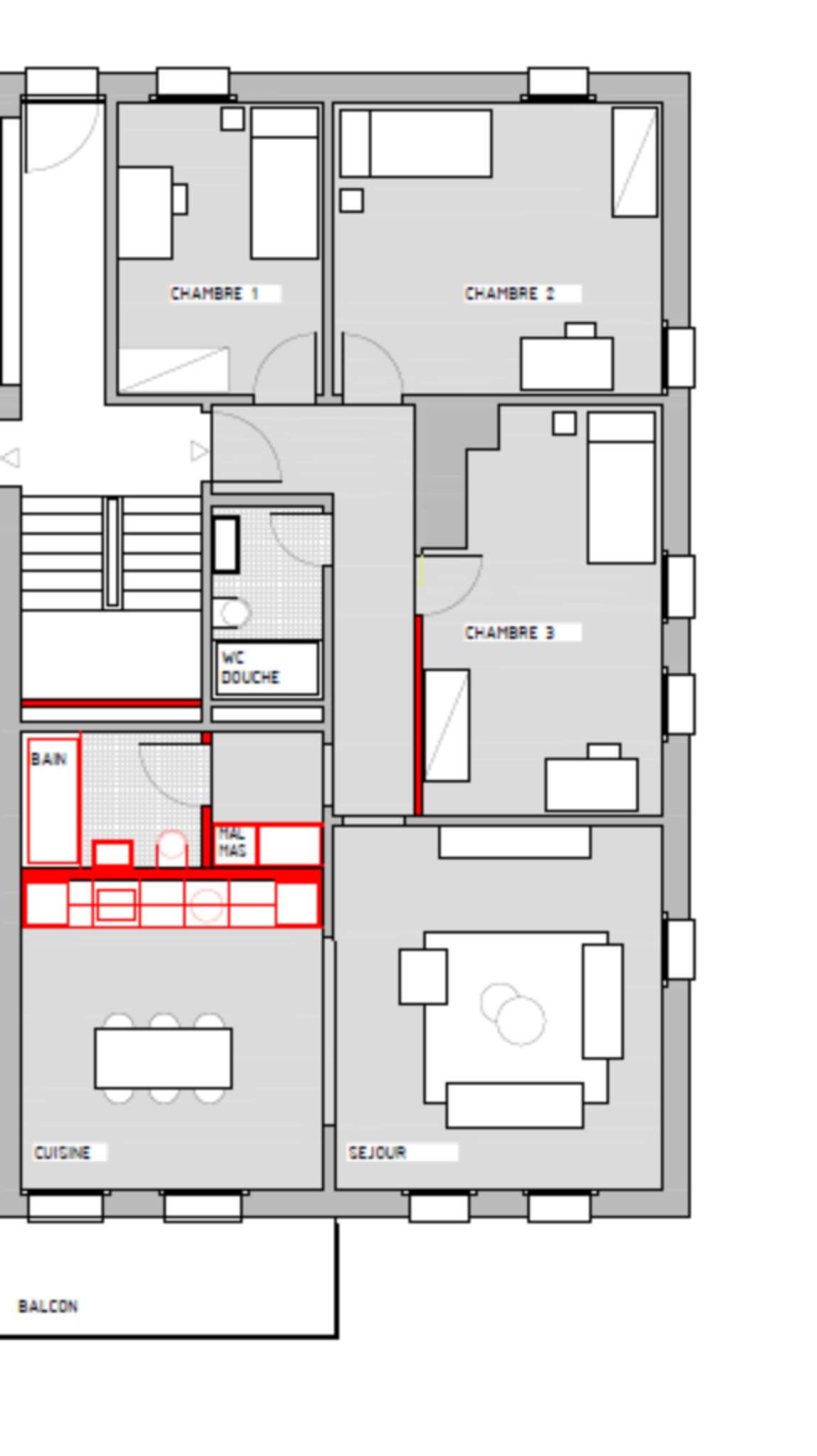 Rénové avec goût et avec des matériaux contemporain, parquet au sol, 3 chambres à coucher, 1 salle de douche, 1 salle de bains, colonne de lavage/séchage, cuisine ouverte entièrement équipée avec de l’électroménager Siemens, donnant sur un grand séjour/salle à manger, prolongé par un balcon, vue dégagée sans vis-à-vis.