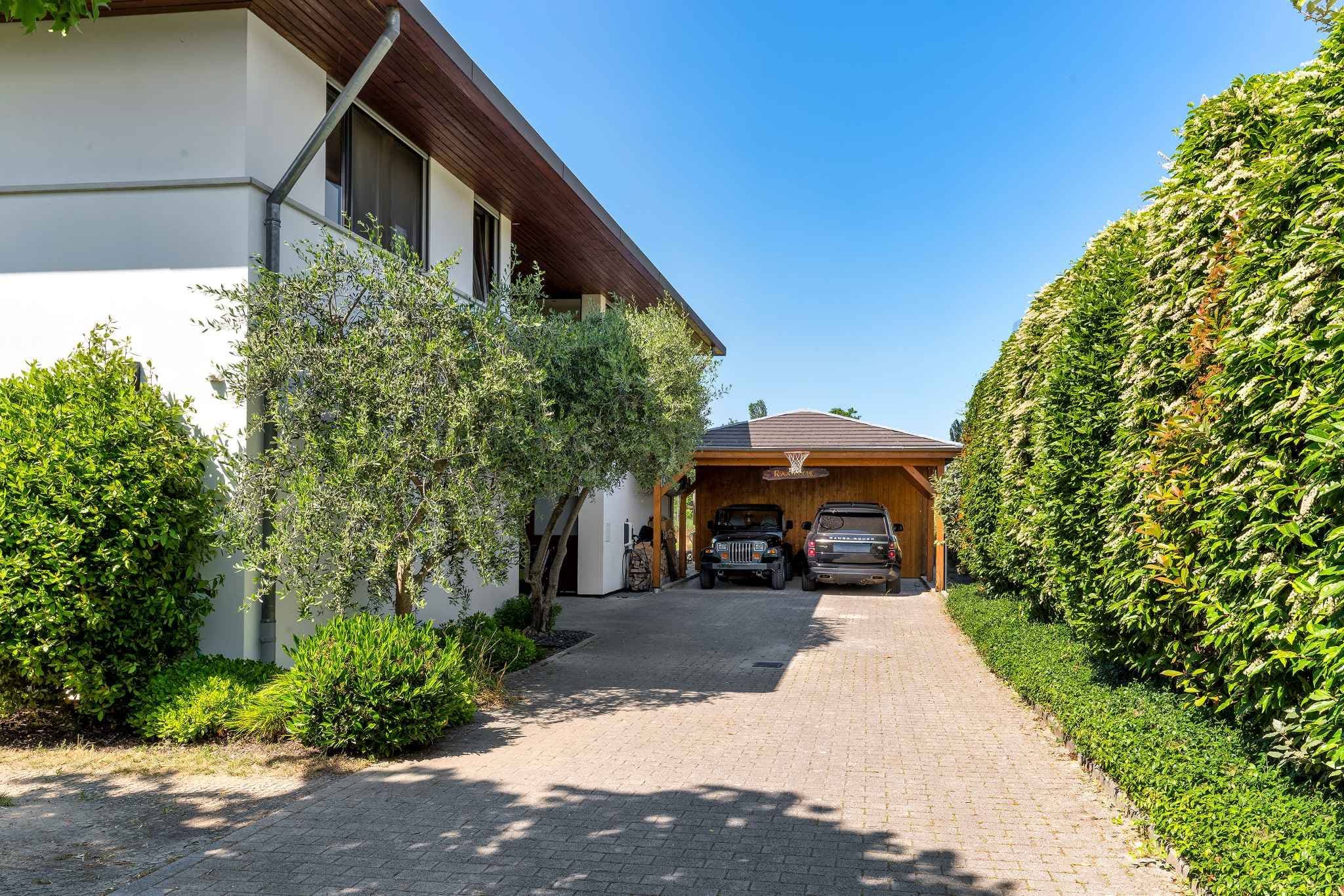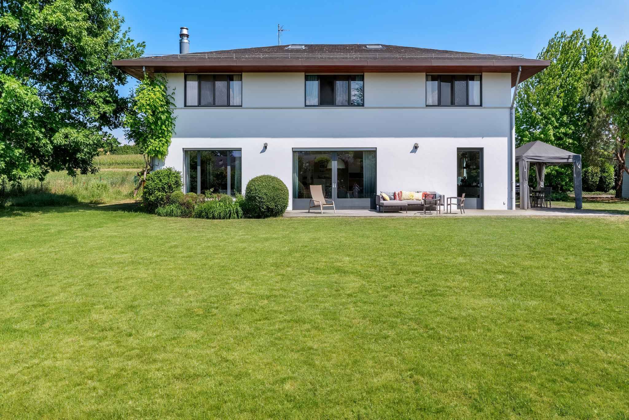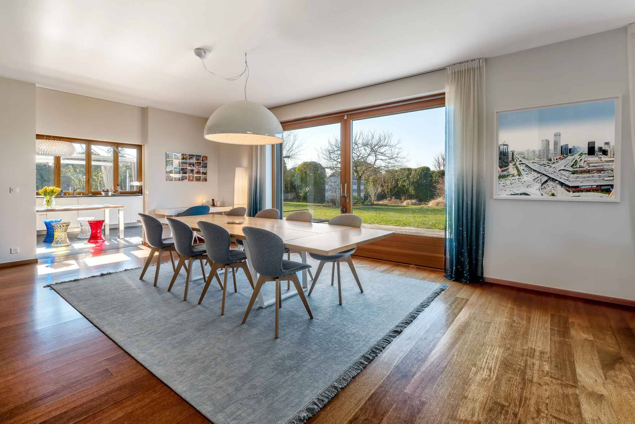 La villa se développe sur trois niveaux hors sol, complétés par un sous-sol. Au rez-de-chaussée, les pièces de vie très lumineuses s’ouvrent sur le jardin et les terrasses. Le premier étage accueille cinq chambres à coucher, dont une belle suite parentale avec salle de douche attenante. Les combles ont été aménagées en une grande salle polyvalente, parfaite comme salle de jeux, bureau ou espace de loisirs.