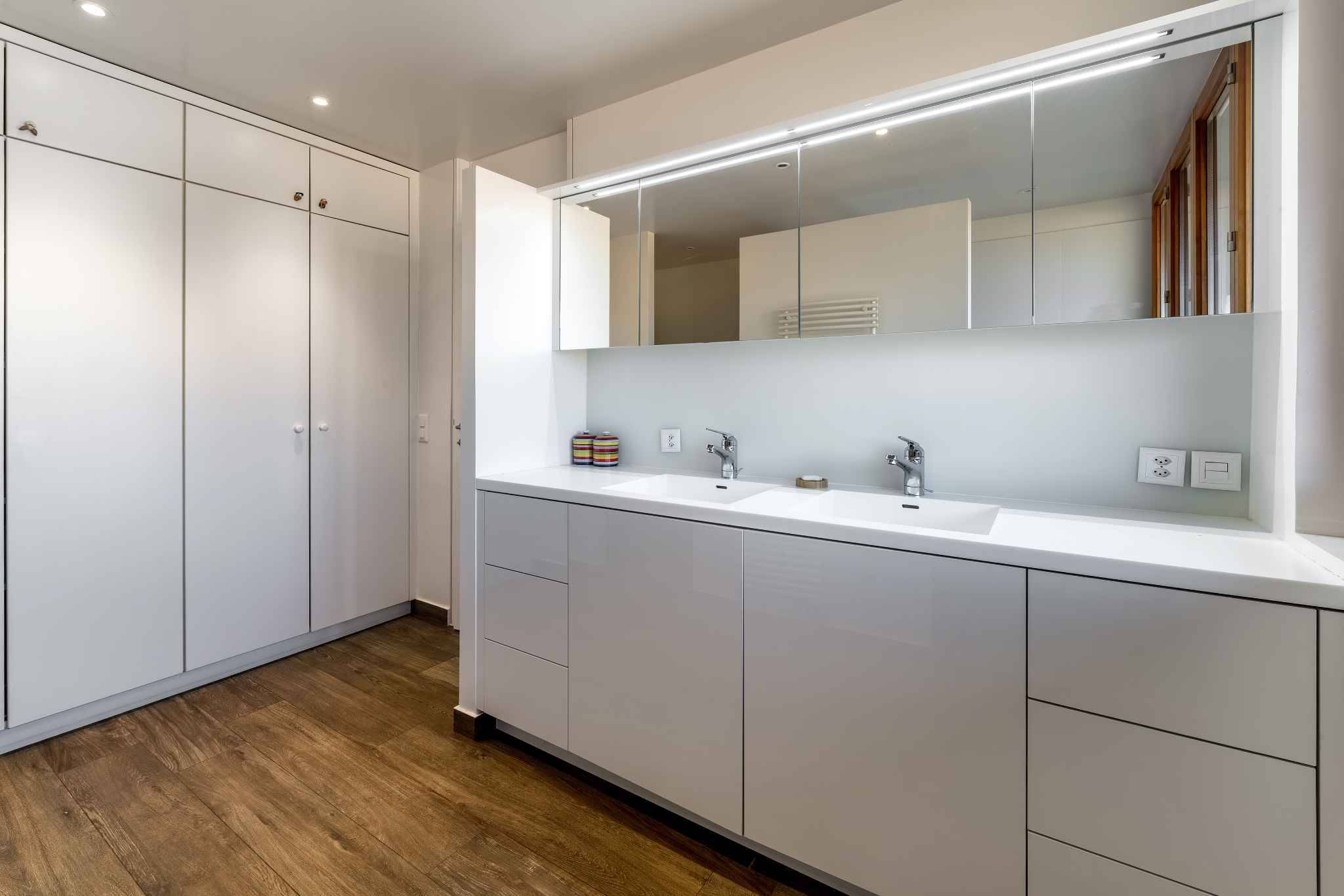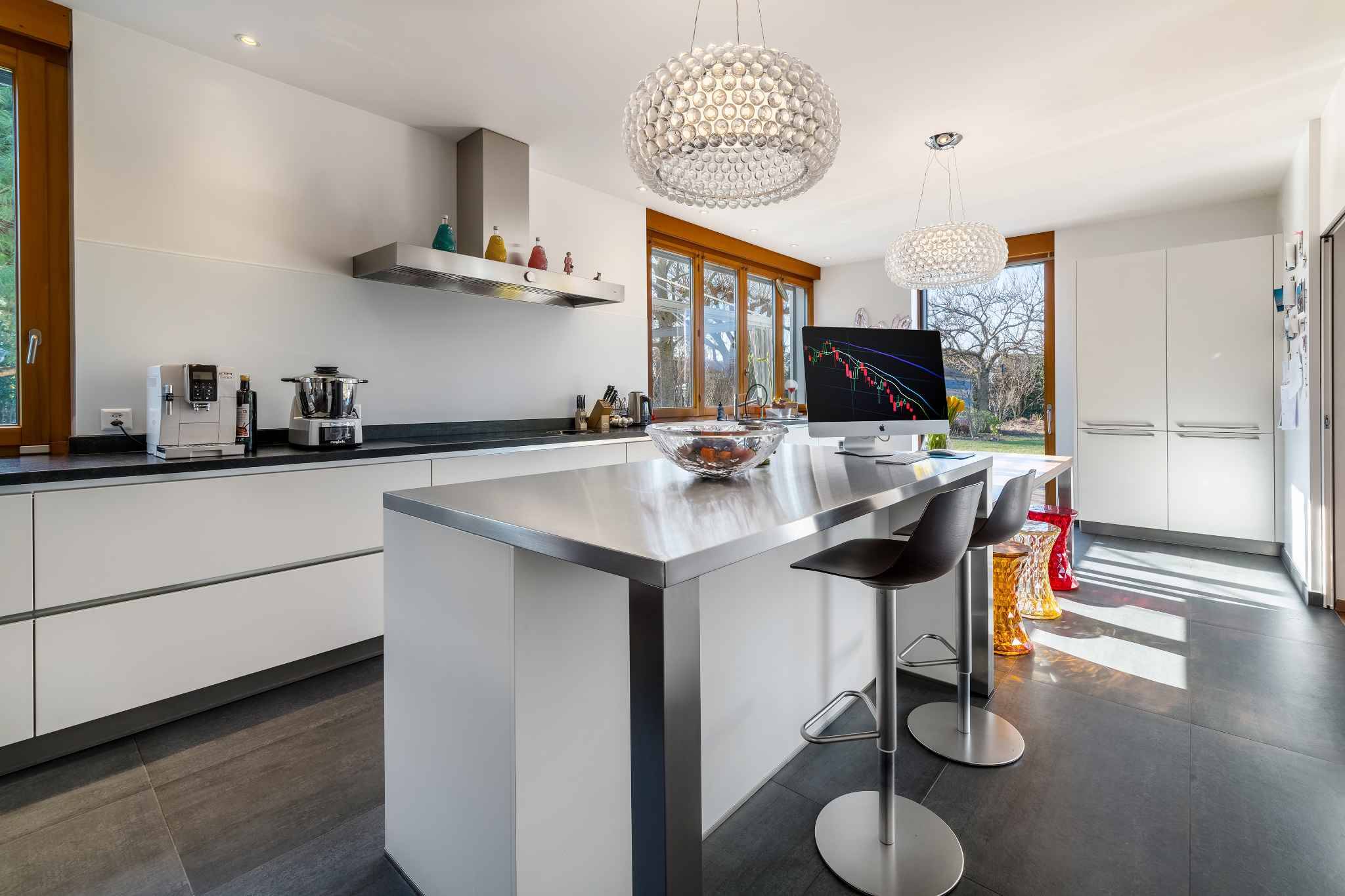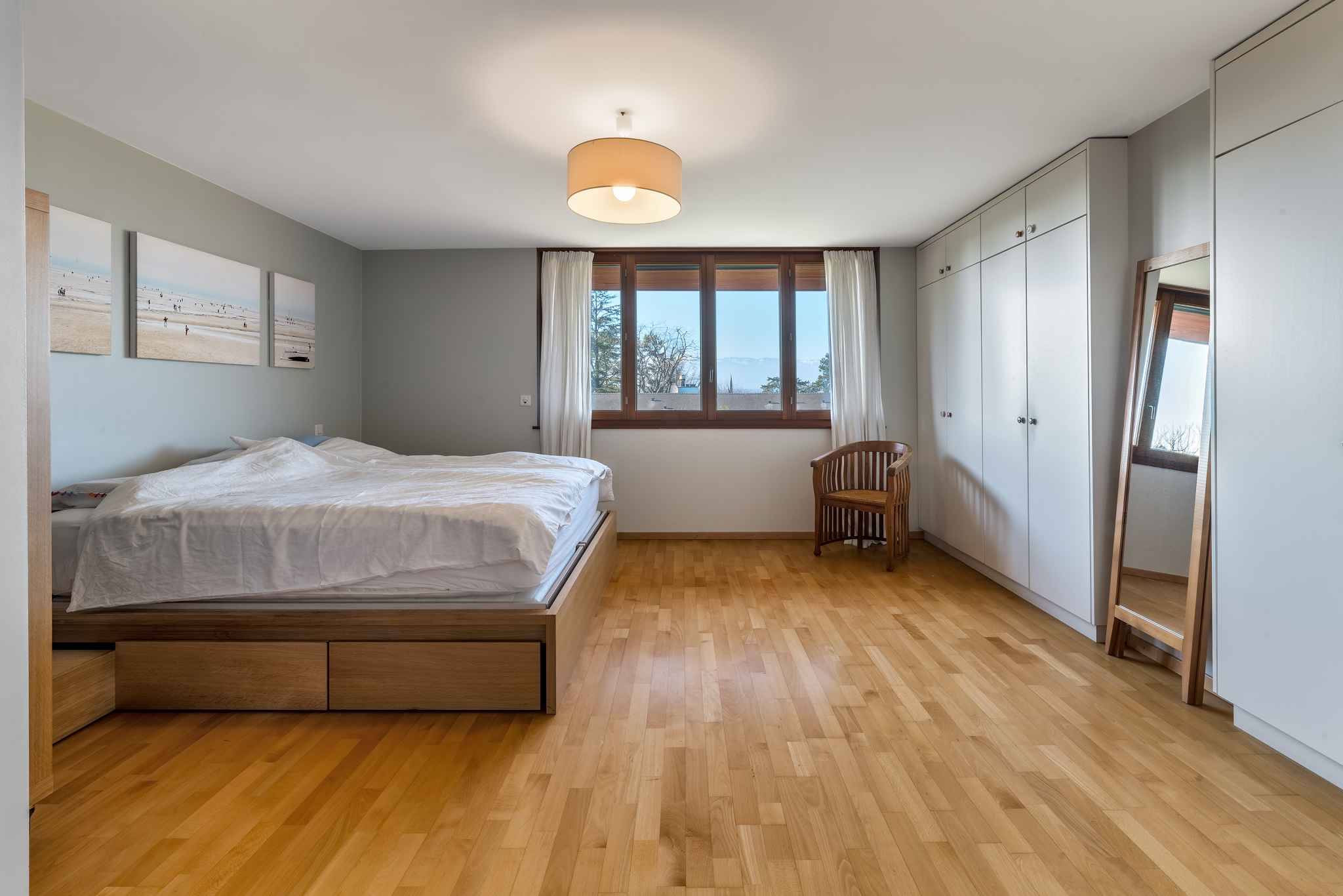 La villa se développe sur trois niveaux hors sol, complétés par un sous-sol. Au rez-de-chaussée, les pièces de vie très lumineuses s’ouvrent sur le jardin et les terrasses. Le premier étage accueille cinq chambres à coucher, dont une belle suite parentale avec salle de douche attenante. Les combles ont été aménagées en une grande salle polyvalente, parfaite comme salle de jeux, bureau ou espace de loisirs.
