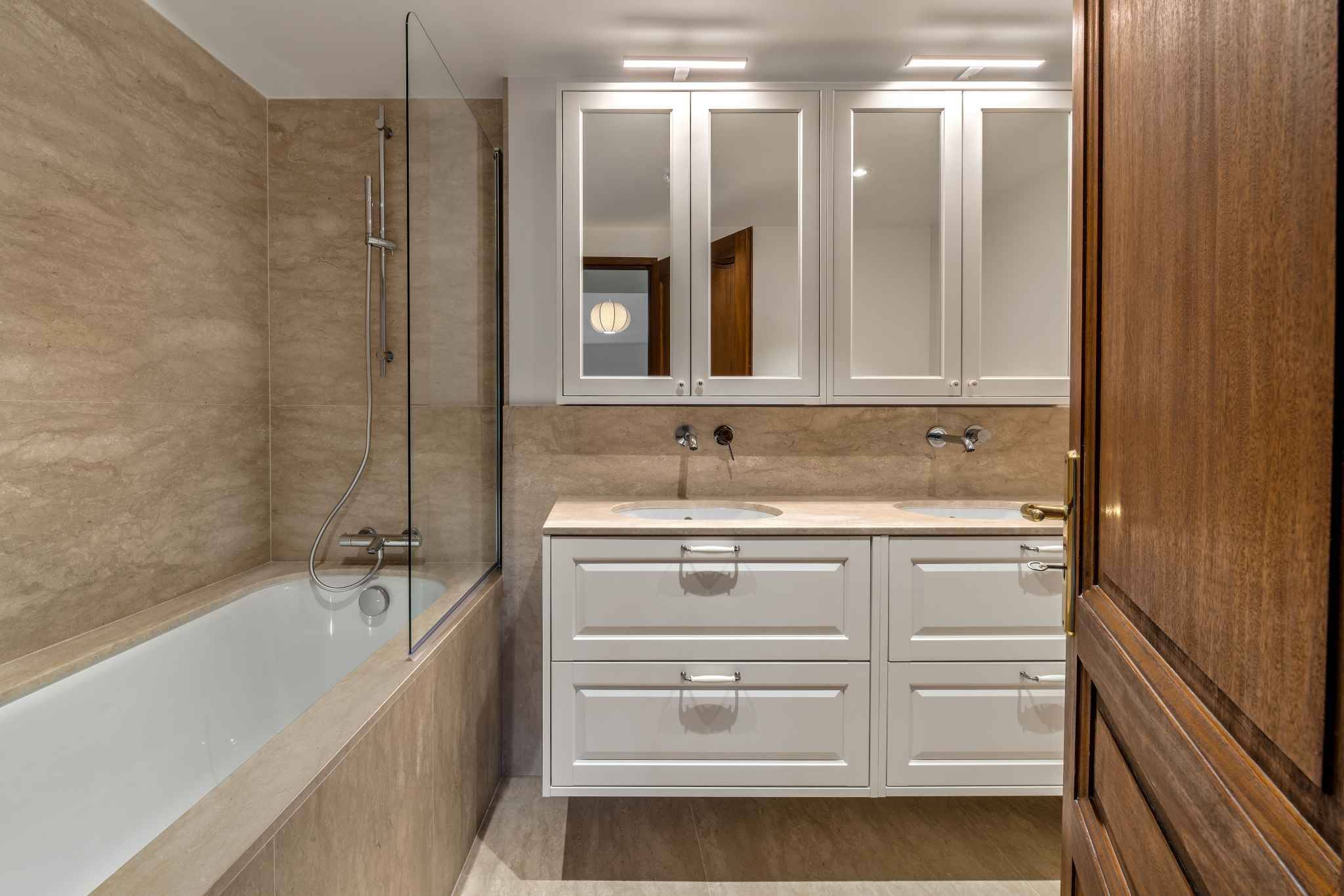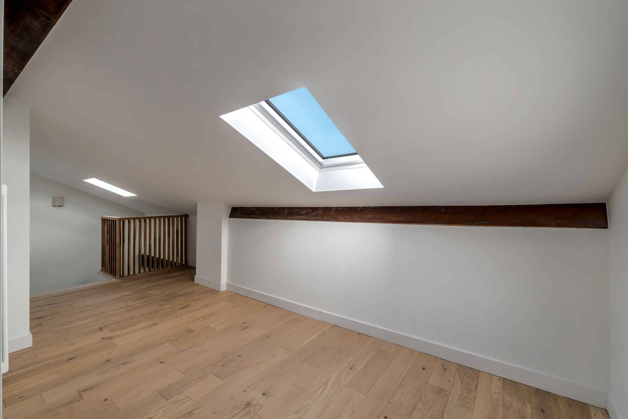 Les deux premiers étages sont aménagés chacun avec une grande chambre à coucher et une salle de bains complète. Le dernier niveau accueille une chambre mansardée avec sa salle de douche complète.