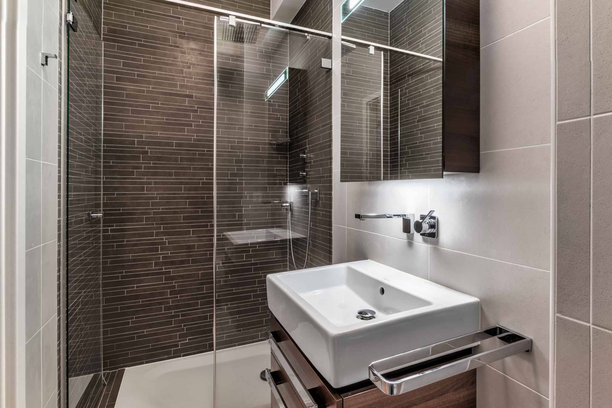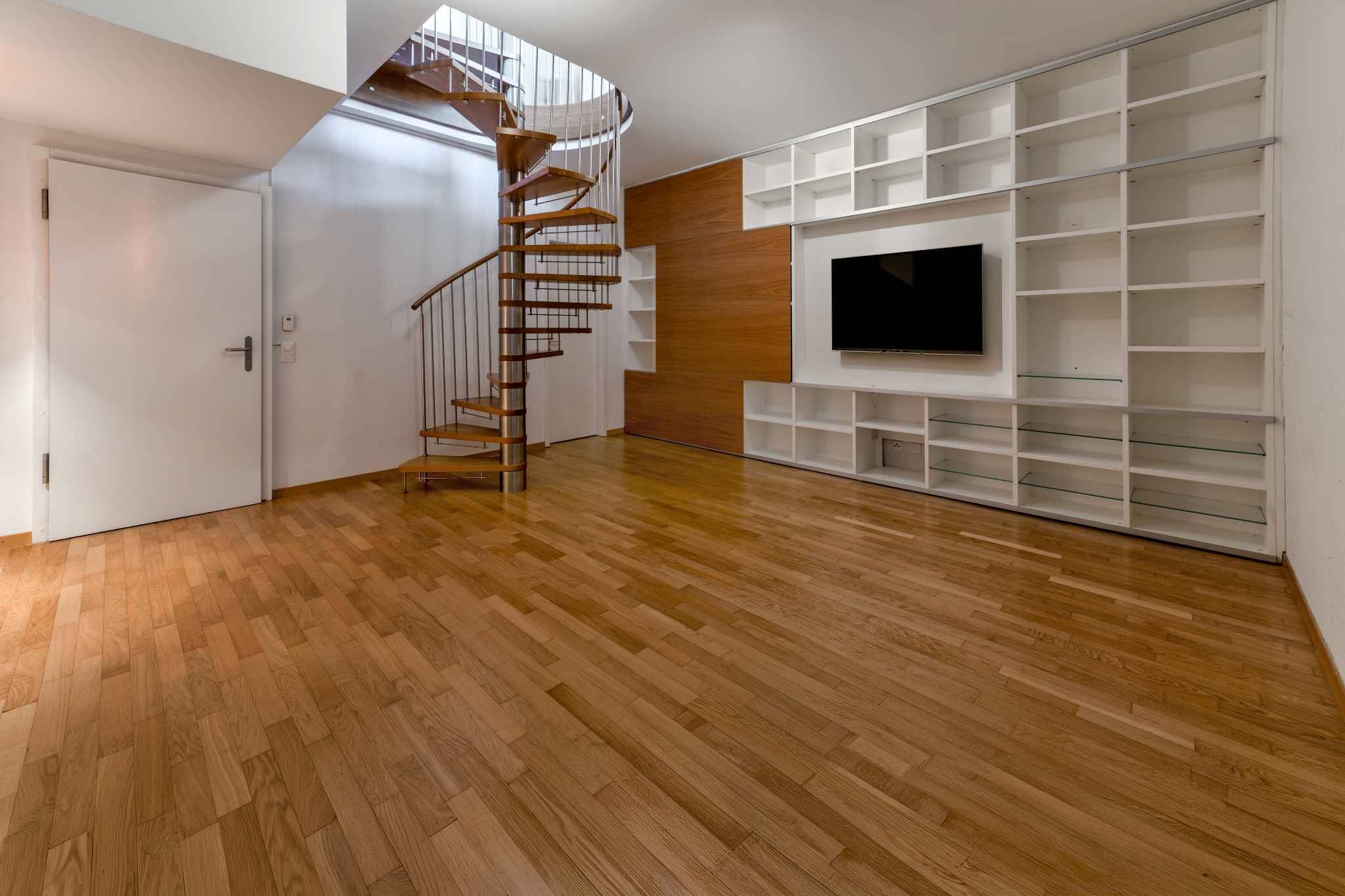 Le niveau inférieur propose une grande pièce polyvalente pouvant servir de salle de jeux ou de salle de sport, une salle de douche complète, une cave ainsi qu’un accès extérieur direct au parking souterrain.