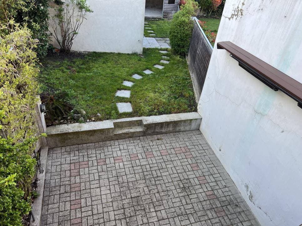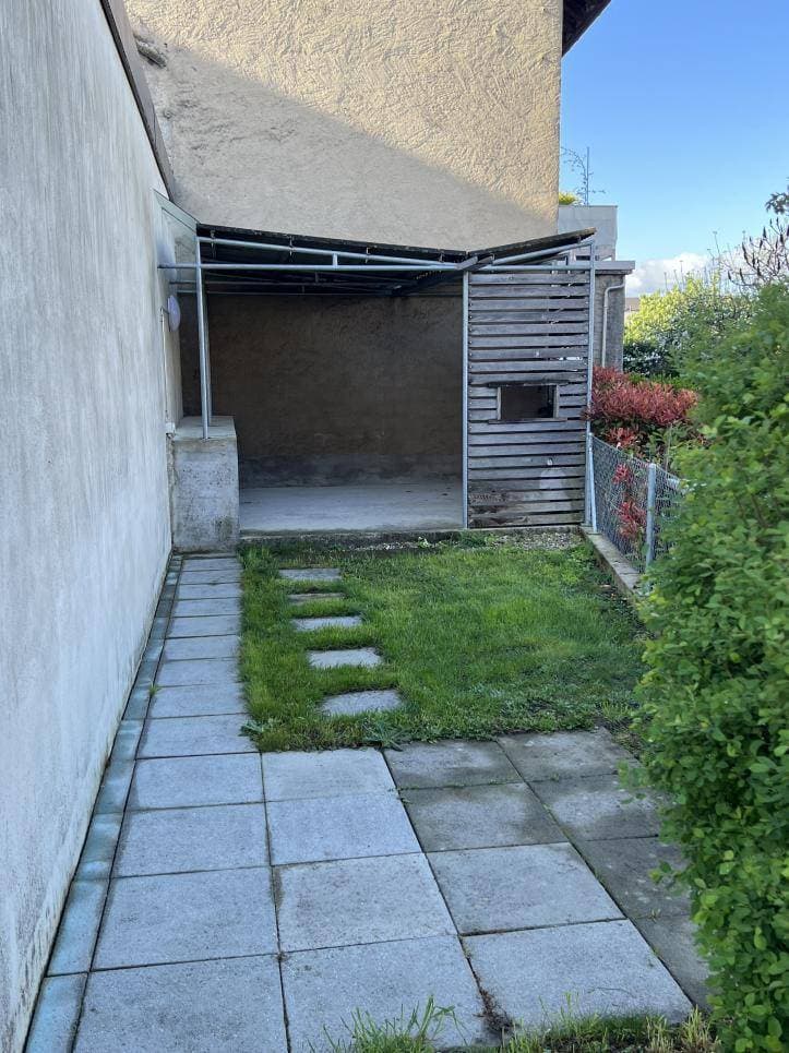 À l'extérieur, on retrouve un petit jardin et un couvert.