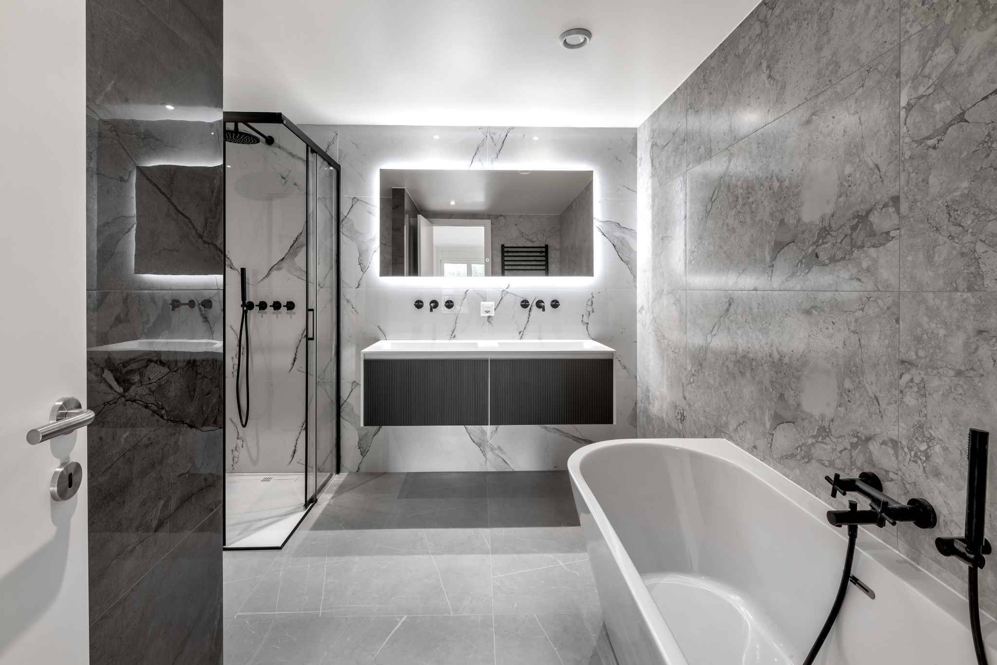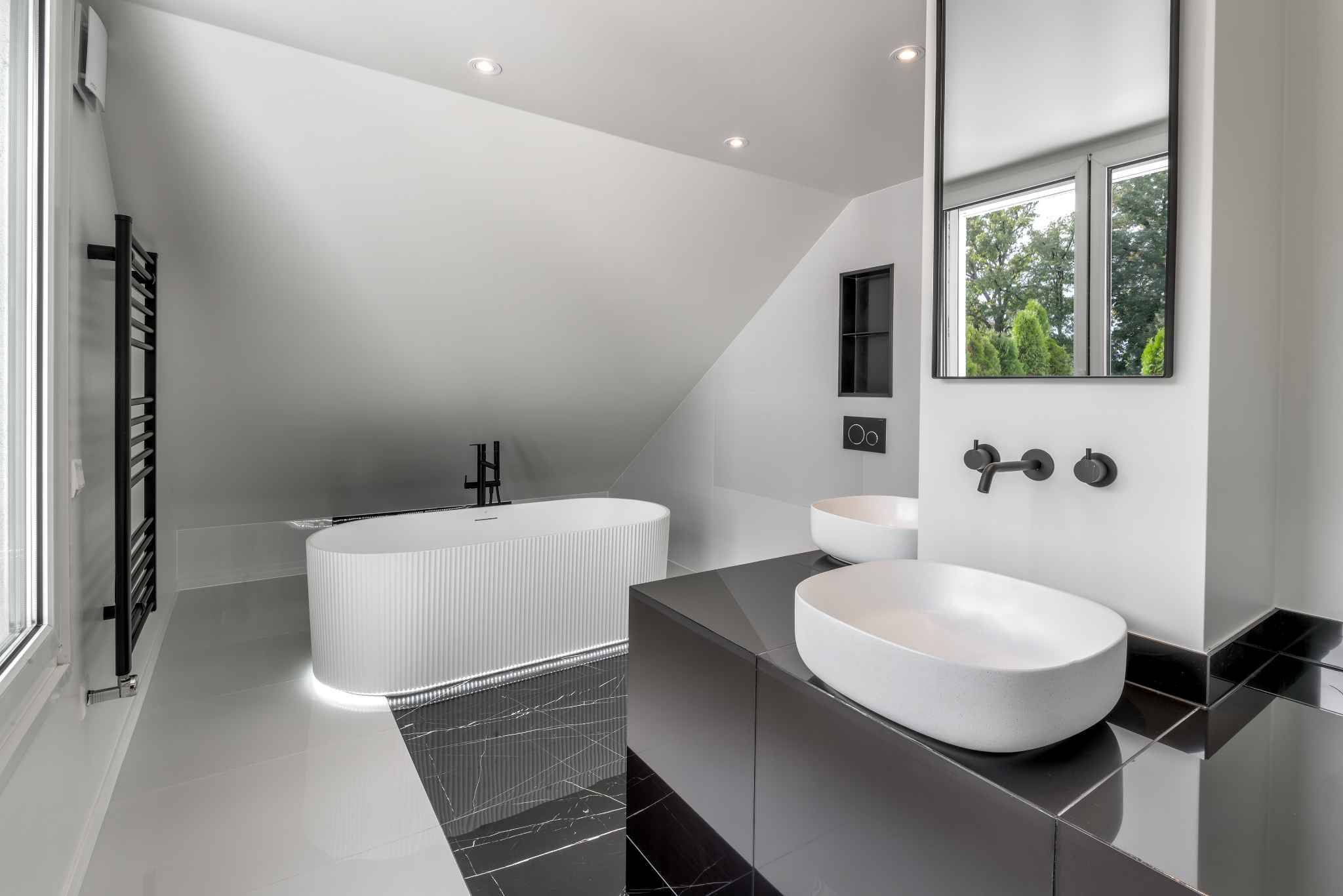 On the first floor, a spacious entrance hall welcomes you, along with guest toilets featuring a dressing area and a stunning fully equipped kitchen with central island. The expansive living and dining room opens onto a loggia overlooking the park, creating a bright and inviting living space. Two large bedrooms, each with its own en-suite bathroom with bath and shower, complete this level.
