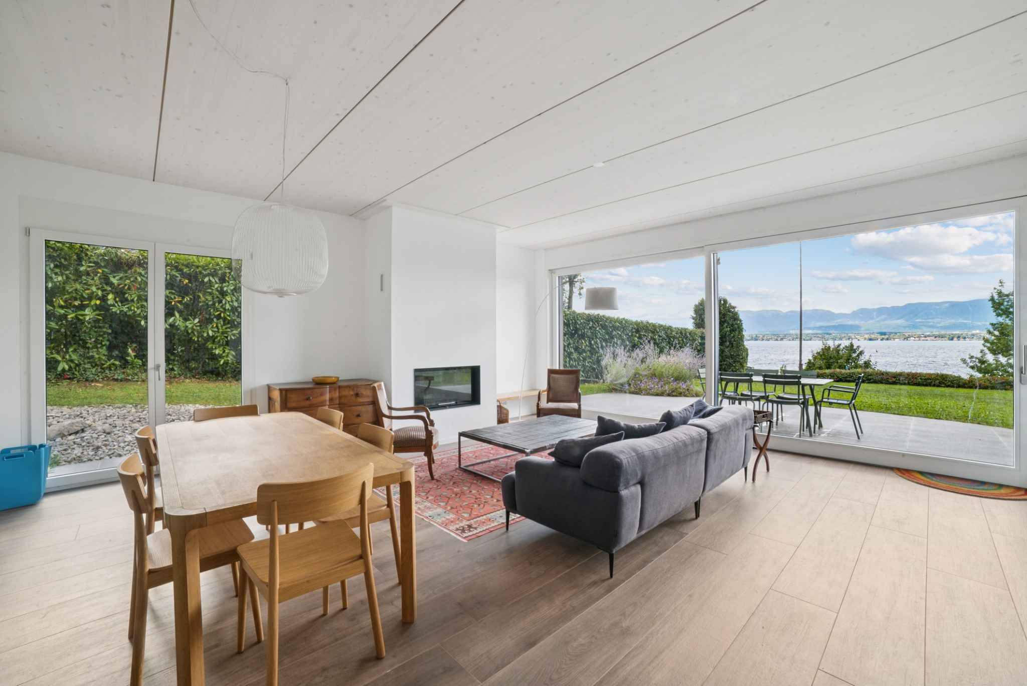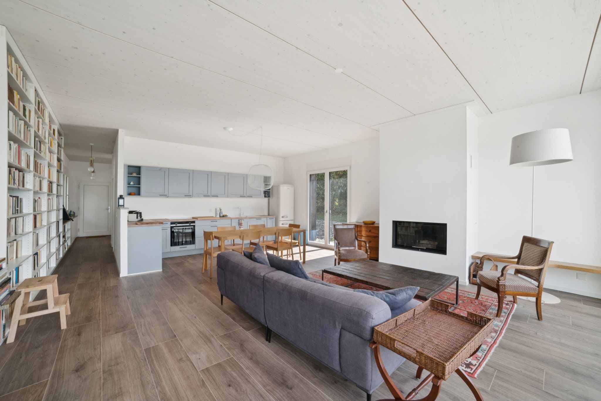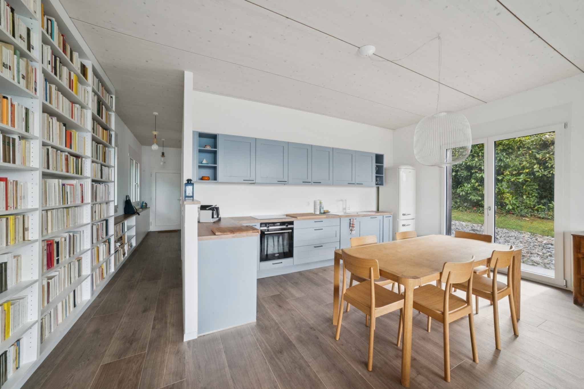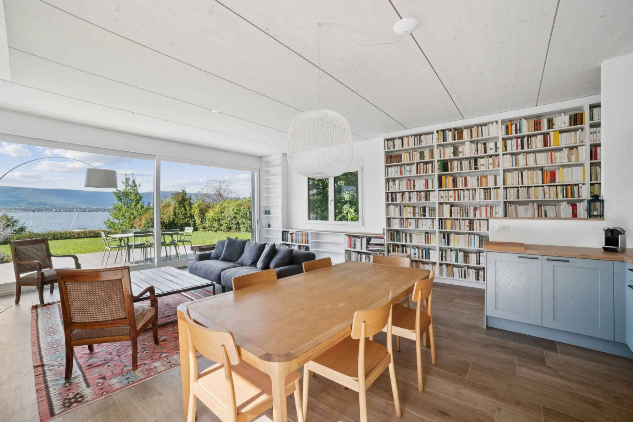 Espace jour: cuisine ouverte sur grand séjour avec une belle bibliothèque integrée, donnant sur une terrasse avec vue magnifique sur le lac.