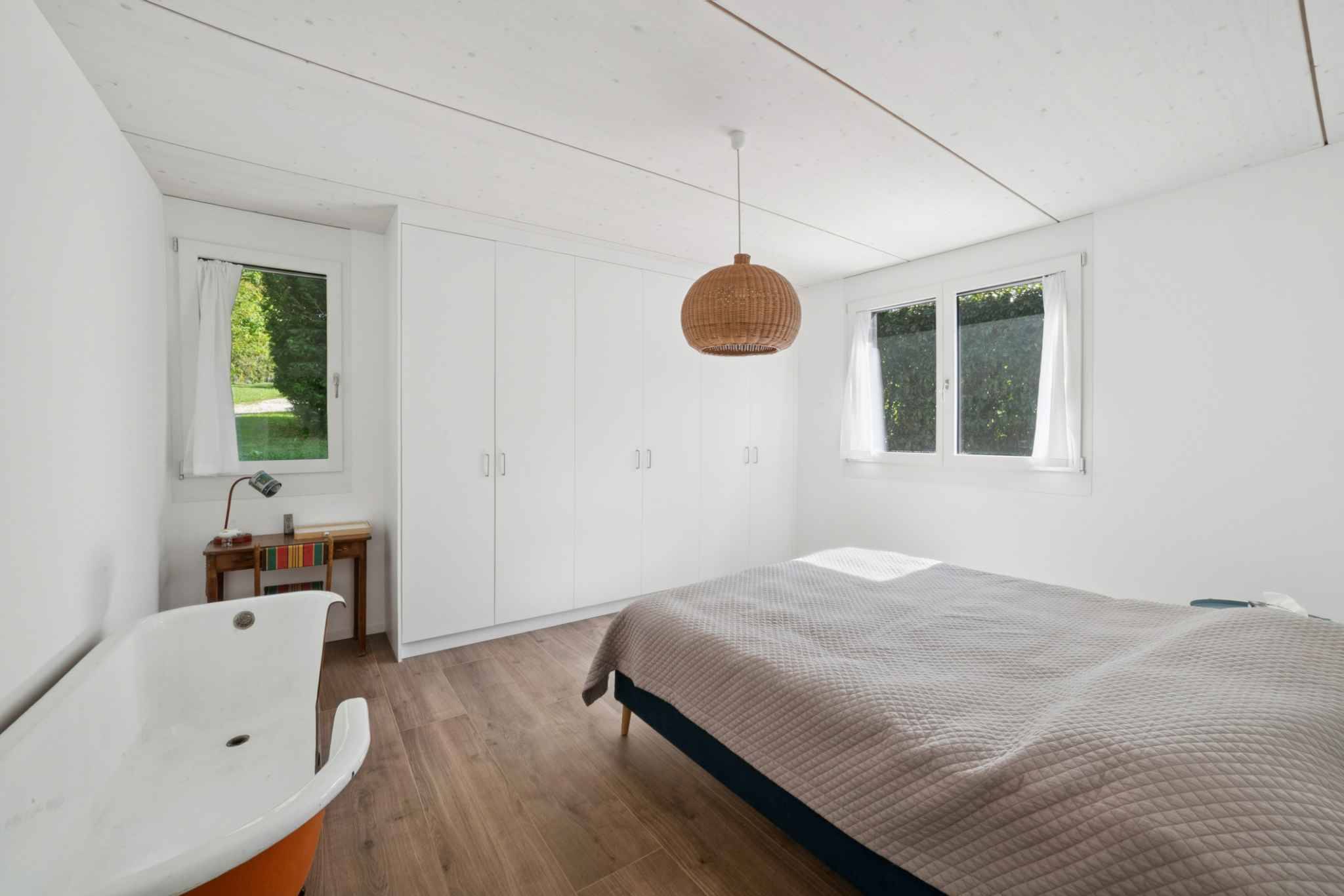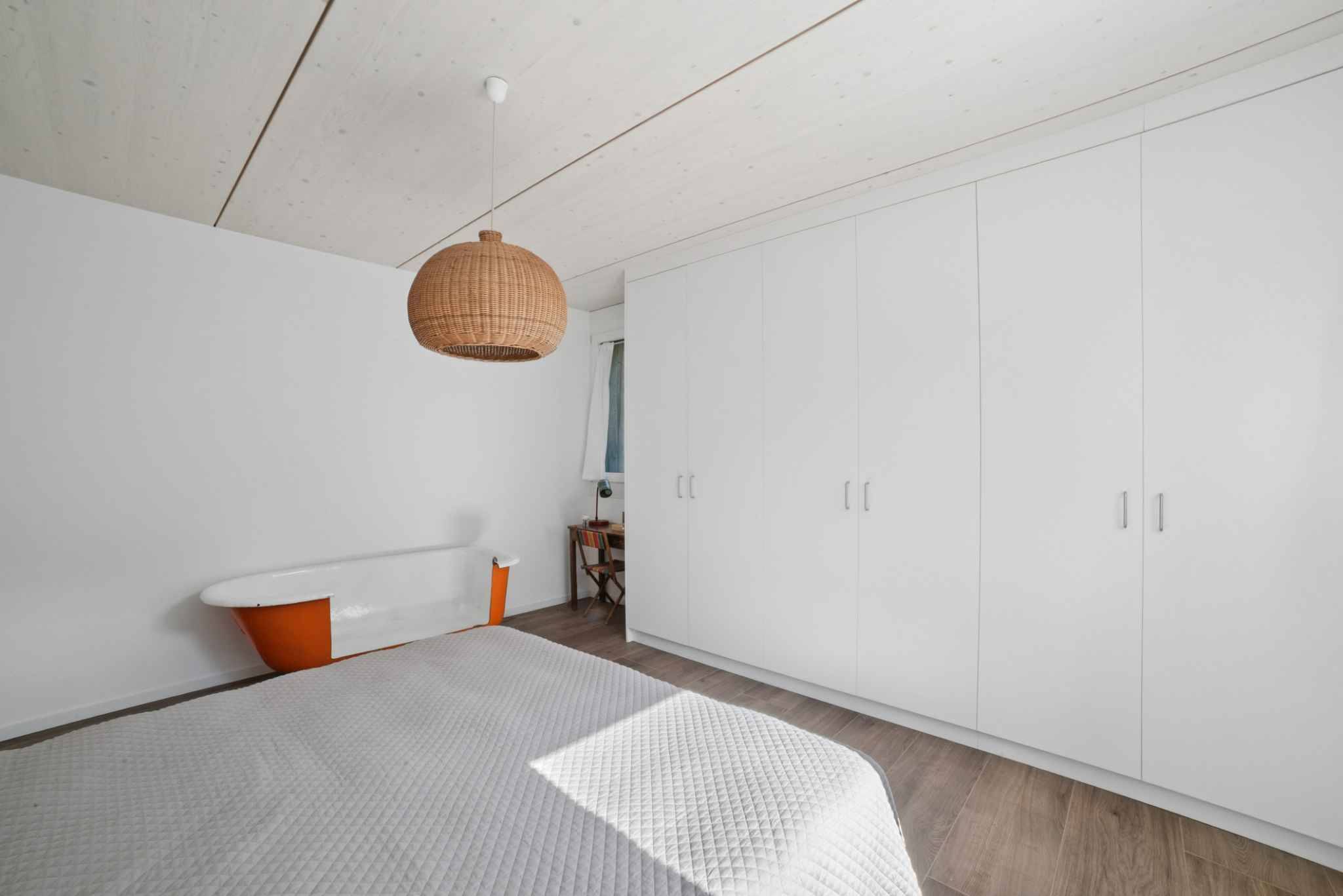 Espace nuit: une chambre avec rangements, une chambre principale avec rangements et salle de bains (toilettes) attenante.