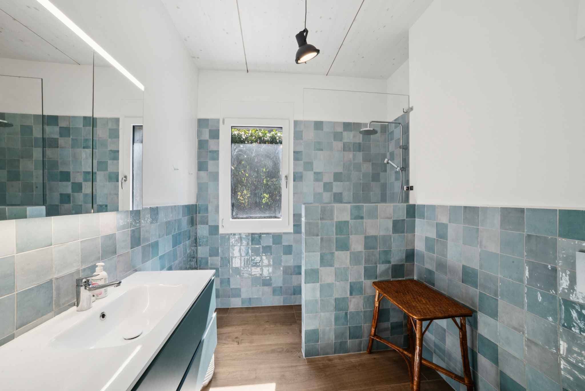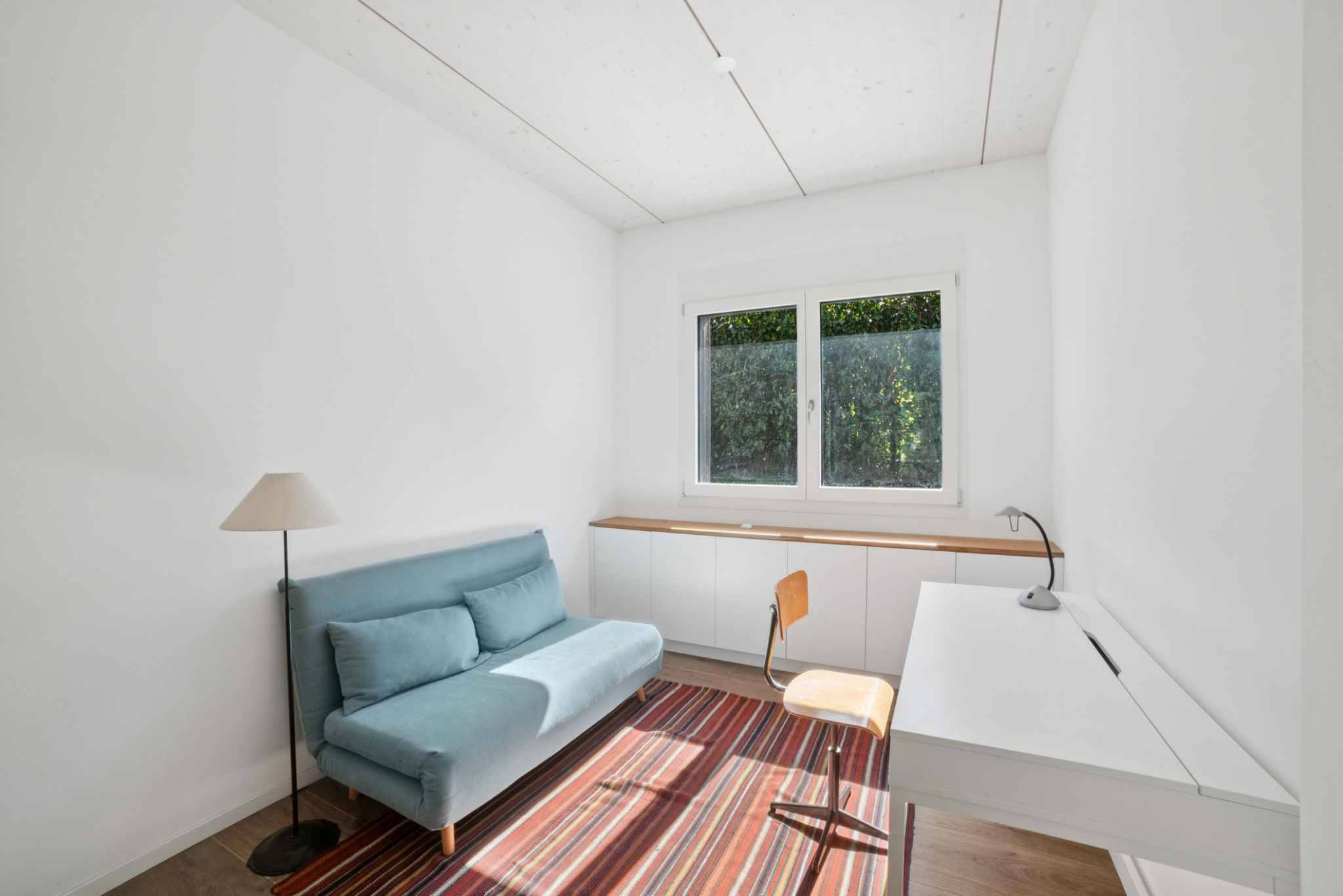 Rez: entrée, petite chambre ou bureau, espace rangements et buanderie, salle de douche à l'italienne avec toilettes.